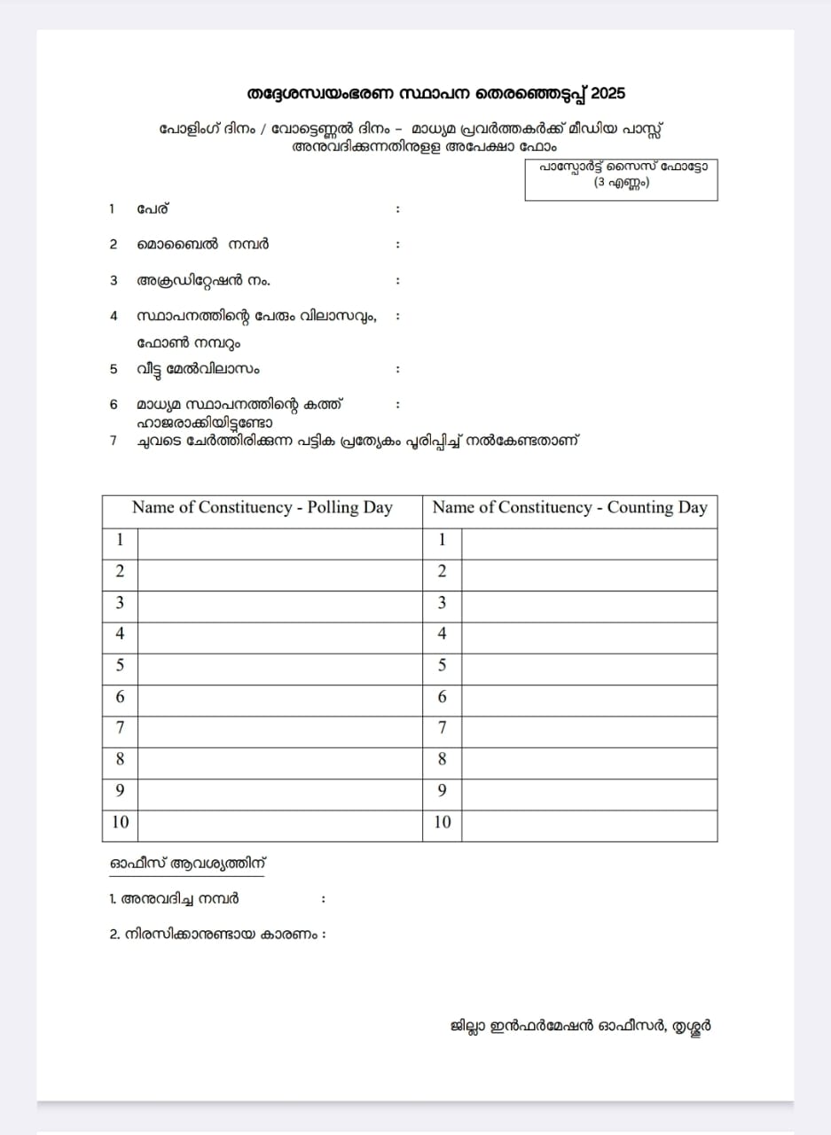 തൃശ്ശൂർ: ജില്ലയിൽ തദ്ദേശ തിരഞ്ഞെടുപ്പ് വോട്ടെടുപ്പും വോട്ടെണ്ണലും കവർ ചെയ്യുന്നതിനുള്ള മാധ്യമ പാസിന് ഇപ്പോൾ അപേക്ഷിക്കാം. ഐ&പിആര്‍ഡി മീഡിയ ലിസ്റ്റിലുള്ള അച്ചടി, ദൃശ്യ മാധ്യമ പ്രതിനിധികൾ സ്ഥാപന തലവൻ്റെ കത്ത് (സമക്ഷം: ജില്ലാ കളകർ & ജില്ലാ തെരഞ്ഞെടുപ്പ് ഓഫീസർ), ഓരോരുത്തരുടെയും മൂന്ന് ഫോട്ടോ എന്നിവ സഹിതം നിർദിഷ്ടമാതൃകയിൽ ഡിസംബർ ഒന്ന് വൈകിട്ട് അഞ്ചിനു മുമ്പായി ജില്ലാ ഇൻഫർമേഷൻ ഓഫീസിൽ അപേക്ഷ നൽകണം. ഒരു സ്ഥാപനത്തിൽ നിന്ന് എത്ര പ്രതിനിധികളുണ്ടോ അവർക്കെല്ലാം കൂടി സ്ഥാപന മേധാവിയുടെ (ബ്യൂറോ ചീഫ്) ഒരു കത്ത് മതിയാകും. എന്നാൽ നിർദ്ദിഷ്ടഫോം ഓരോരുത്തരും പൂരിപ്പിച്ച് നൽകണം.