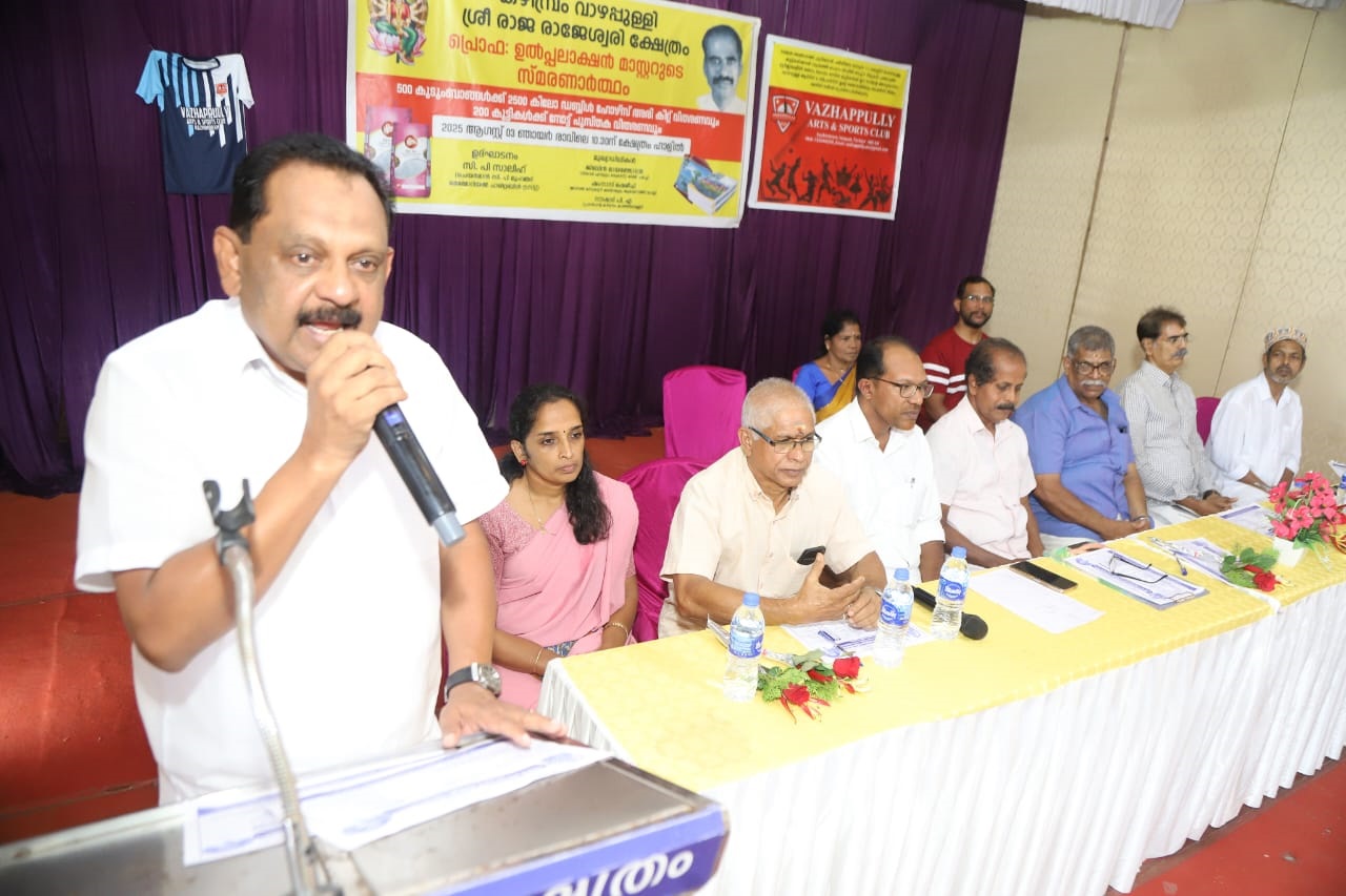 കഴിമ്പ്രം: വാഴപ്പുള്ളി ശ്രീ രാജ രാജേശ്വരി ക്ഷേത്രത്തിൽ പ്രൊ. ഉത്പലാക്ഷൻ മാസ്റ്ററുടെ സ്മരണാർത്ഥം 500 നിർധന കുടുംബങ്ങൾക്ക് അരികിറ്റും, 200 വിദ്യാർത്ഥികൾക്ക് നോട്ട് പുസ്തകങ്ങളും വിതരണം ചെയ്തു. ക്ഷേത്ര ഭരണസമിതിയുടെ നേതൃത്വത്തിൽ നടന്ന ചടങ്ങിൽ പ്രസിഡണ്ട് ഉണ്ണികൃഷ്ണൻ അധ്യക്ഷത വഹിച്ചു. സി പി മുഹമ്മദ് മെമ്മോറിയൽ ചാരിറ്റബിൾ ട്രസ്റ്റ് ചെയർമാൻ സി പി സാലിഹ് വിതരണോദ്ഘാടനം നിർവഹിച്ചു. 38 വർഷത്തെ അംഗനവാടി സേവനത്തിനുശേഷം വിരമിച്ച തങ്കമണിടീച്ചറെ ചടങ്ങിൽ ആദരിച്ചു. കല്യാൺ ഉൽപ്പലാക്ഷൻ അരി വിതരണത്തിനും, ഷൈൻ പട്ടാലി കുട്ടികൾക്കായുള്ള ജേഴ്സിക്കും ഉള്ള ചിലവ് വഹിച്ചു. ഷംനാസ് ഷെരീഫ് (ജനറൽ സെക്രട്ടറി, കരയാമുട്ടം ജുമാ മസ്ജിദ് മഹല്ല്), മുഹമ്മദ് പുളിക്കവീട് (കഴിമ്പ്രം കാഞ്ഞിരപ്പള്ളി കമ്മിറ്റി), ട്രഷറർ വി.കെ. ഹരിദാസൻ എന്നിവർ സംസാരിച്ചു. വട്ടപ്പരത്തി മണപ്പുറം ടെറഫിൽ നടന്ന 12 വയസ്സിന് താഴെയുള്ള കുട്ടികളുടെ ഫുട്ബോൾ ടൂർണമെന്റിൽ രണ്ടാം സ്ഥാനം നേടിയ ക്ഷേത്ര മൈതാനത്ത് പരിശീലനം നടത്തുന്ന കുട്ടികൾക്ക് വാഴപ്പുള്ളി ആർട്സ് ആൻഡ് സ്പോർട്സ് ക്ലബ് ജേഴ്സി നൽകി ആദരിച്ചു. ക്ഷേത്ര വനിതാ സംഘ അംഗമായ തങ്കമണി ടീച്ചർ സ്വാഗതവും സെക്രട്ടറി വി.ആർ. രാധാകൃഷ്ണൻ നന്ദിയും രേഖപ്പെടുത്തി.